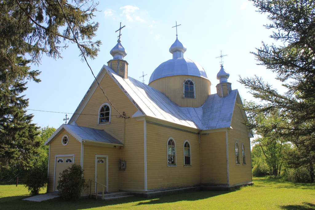 The wooden church, designed by Rev. Phillip Ruh, was constructed by Ivan and Peter Koltusky. The building is dominated by a large central dome and has four smaller decorative domes apexing each of the four corners of the gabled roof. Entry to the church is through a vestibule. The church has preserved its architectural form since 1917 at which time it was enlarged to accommodate its expanding membership. The interior cruciform construction corresponds identically to its exterior form. The interior is dominated by a high open dome with four windows. An iconostas stands before the sanctuary. A large crystal chandelier is suspended from the dome which dominates the axis of the intersecting arms. A steep set of stairs leading up to the choir loft originates on the west side of the nave. The iconostas, built by Zakharko Poloz from St. Catherines, is adorned with icons painted by the hand of Jacob Maydanik. The painting of these icons as well as of others hanging upon the walls of the nave was completed in 1928. In 1984, renovation of the church resulted in the replacement of some of Maydanik’s ornamentation with the decorative painting of Phyllis Haynes and her husband from Fisher Branch, Manitoba. Renovation also included the installation of electrical lighting, heating, ceiling fans and carpeting of the floor of the sanctuary and central aisle of the nave. In 1986 the exterior of the church was renovated under the direction of Peter Prokopchuk of Sandy Lake, Manitoba. At that time new entrance doors were installed.