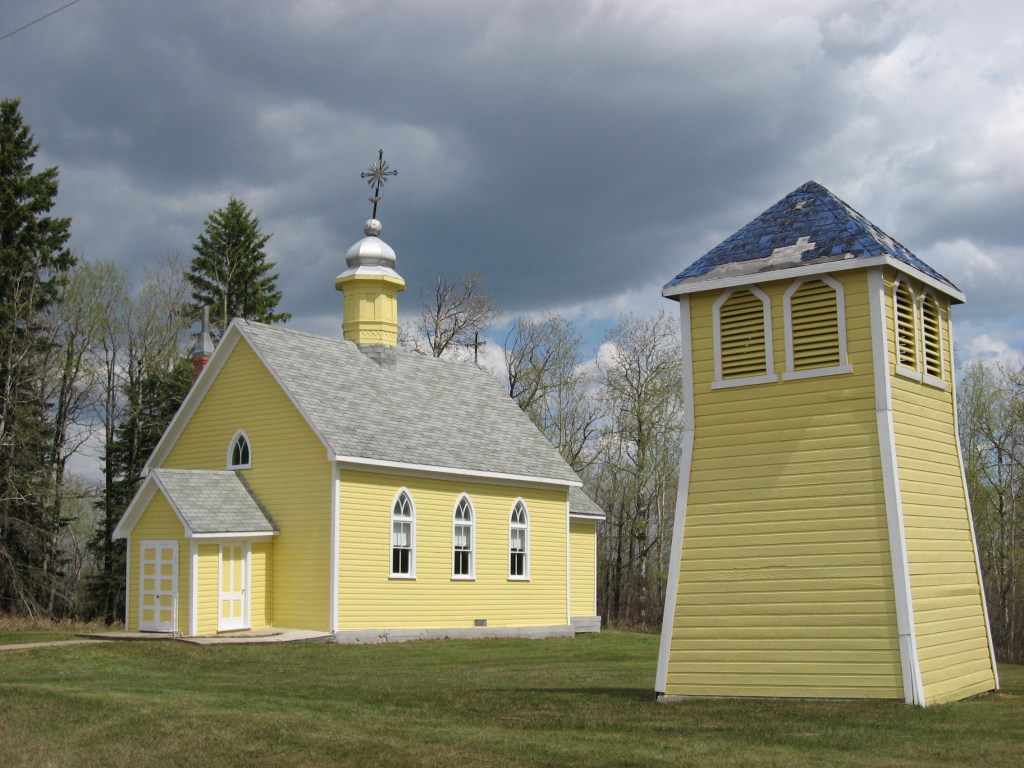 The wood-constructed single-nave building has three rectangular windows with sharply angulated summits built into each lateral wall. The gabled shingled roof is apexed centrally by a small lantern-like tower which is crowned by a dome and small decorative cross. Single-armed crosses project over the west and east summits. Entry to the church is through west and south oriented doors of a porch-vestibule. Within the church, stairs leading up to the choir loft which is supported by two pillars and which contains a single window, originate to the right of the main entrance. The sanctuary is adjoined upon its left side by a sacristy with a single window which exits to the church grounds. A small bell, purchased in 1929, hangs at the entrance to the sanctuary. A flat ceiling rises over the sanctuary. Upon the central panel of the pentagonally-angulated sanctuary wall hangs a large painted depiction of the Ascension (unsigned). The walls to the left and right of the main altar are also adorned with holy images. The sanctuary is separated from the nave by a partition whose three carved-out entrances imitate the appearance of the Royal and Deacon’s Doors of an iconostasis. A red curtain is draped over the central Royal Doors. Upon this partition hang representations of Jesus Christ and the Mother of God, painted upon particleboard. Four other holy images in the nave are painted on canvas, affixed to the wall, and additionally ornamented with painted decorative borders. The upper expanses of the nave, supported structurally by a metal cable, are decoratively bordered as well. The nave is dominated by a vaulted ceiling from the centre of which is suspended a candle-lit chandelier. The wooden floor of the church is painted and partially carpeted in the sanctuary. Within the nave are ten pews, each providing seating for approximately ten faithful, as well as choir stalls located upon the right wall. A wood-burning stove stands to the immediate left of the choir stalls. The nave measures 26.5 x 22 feet; the sanctuary’s dimensions are 17 x 13 feet. A single-bell belfry stands near the church; east of it lies the parish cemetery. The church and cemetery land was donated by Trofym Dutchak. On a somewhat wooded site across the road from the church stands the Ruthenia Hall which at one time served as the cultural-educational centre of the community. The Ruthenia school and 1924 post office of the same historic Ukrainian name at one time also stood upon this site.