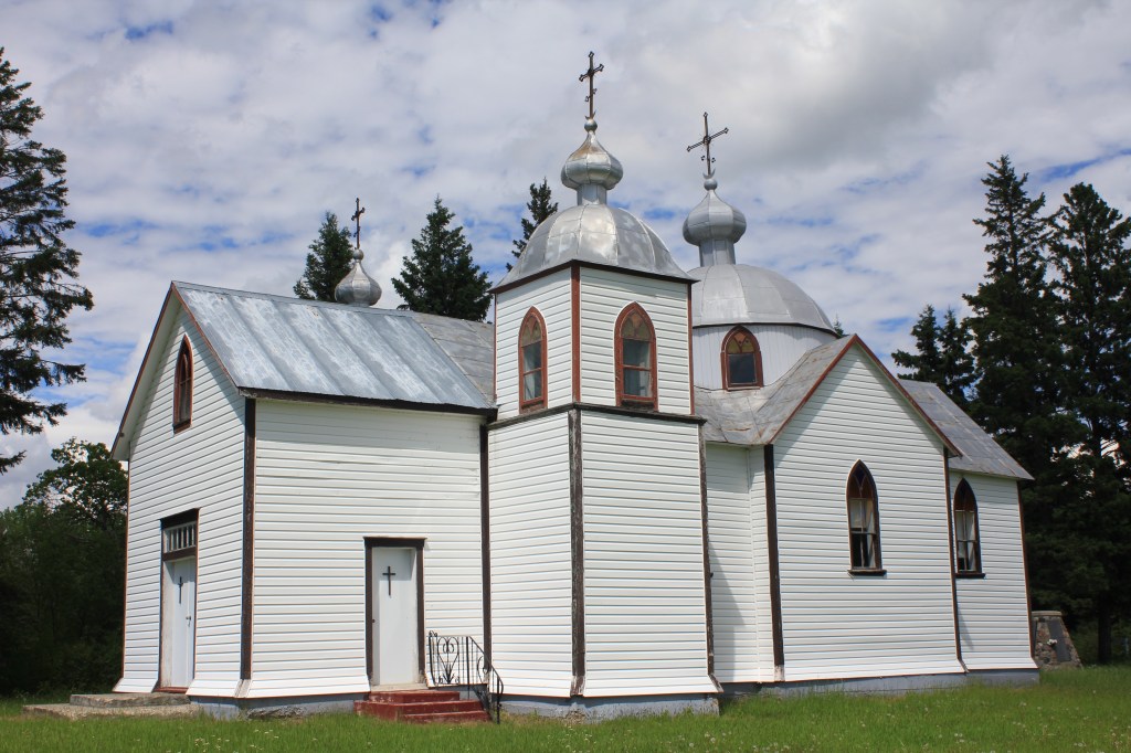 The church was constructed upon 5 acres of land donated to the parish by Theodore Barabash. Construction was accomplished by parish faithful under the foremanship of Mark and Theodore Nowosad and Wasyl Kuch at a cost of $1500.00. The wooden cruciform church has three sheet metal-covered domes – a central one dominating the axis of the intersecting arms and two smaller ones apexing two frontal towers. The exterior walls are covered with vertical painted wood siding. Entry to the church is from the west through a large porch-vestibule which also has a southern access. The church interior is finished with wooden siding, the upper expanses of which are painted a light colour, the lower sections a darker shade, resulting in a natural-looking uniform appearance. Hanging upon the walls are several holy images, primarily oil prints. A large church patron icon on the wall behind the main altar and depictions of the Mother of God and of St. Nicholas on the walls of the transversal naves were paint ed in 1920 by Jacob Sych. A sacristy with one window is located on the right side of the main altar. In the nave each lateral wall has two windows built into it as do the two towers and vestibule. From the centre of the high dome hangs a large candle-lit chandelier. Stairs originating at the base of a tower lead up to the choir loft which is supported by two pillars connected at their summits by a decorative partition into which have been carved three arches resulting in an open-door appearance. Within the nave are wooden pews which provide seating for 55-60 faithful, processional articles, and a wood-burning stove on the nave’s north wall. The wooden painted floor is carpeted up the central aisle and before the main altar. The interior of the church, including the sanctuary, measures 43 feet in length; the intersecting arms total 22 feet in width.